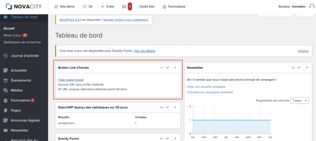 Les liens brisés sont également visibles sur la page d’accueil de l’interface d’administration (backoffice) :