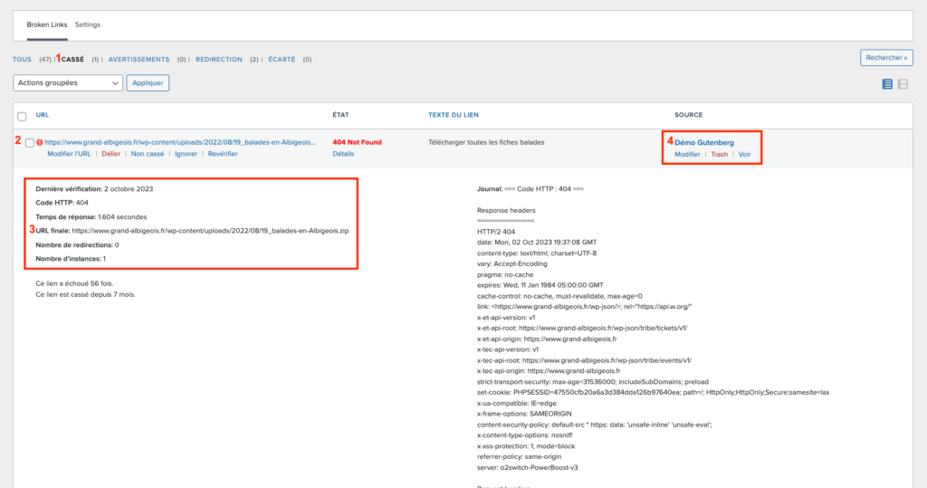 | 2 | Url | En cliquant sur « Details » dans la colonne Etat, vous accéderez à diverses informations concernant le lien rompu. |
