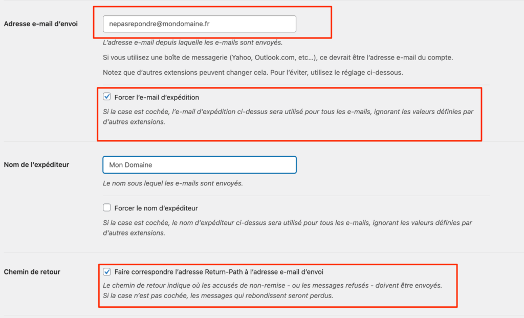 Vérifiez que l’adresse d’envoi est correcte et que les cases « Forcer l’email d’expédition » et « Faire correspondre l’adresse Return-Path à l’adresse e-mail d’envoi » sont cochées.