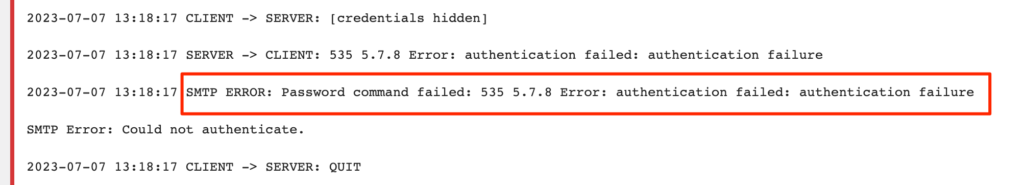 Exemple ici une erreur due à des identifiants incorrects :