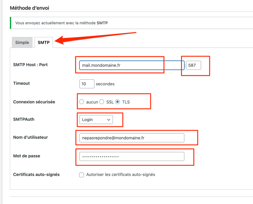 Renseignez les informations SMTP obtenues auprès du gestionnaire de votre service mail.