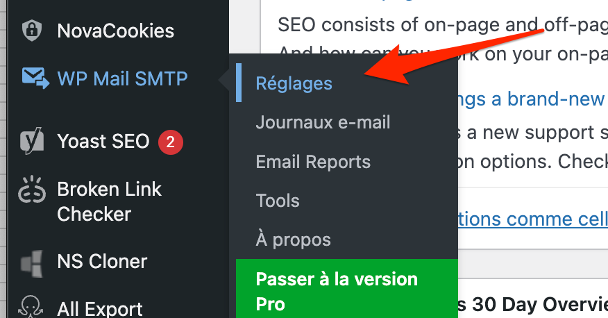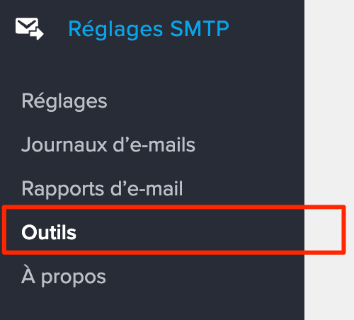 Dans le backoffice de votre sites, cliquez sur WP Mail SMTP > Réglages en colonne de gauche. (le menu peut aussi se nommer « Réglages SMTP » ou avec un autre nom mais la même icône)