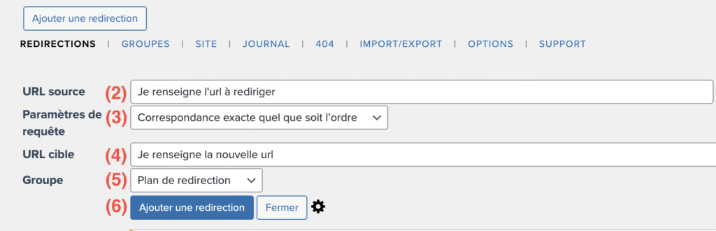5. Groupe : si vous souhaitez classer vos redirections (ex : migration de site, pages supprimées, plan de redirection)